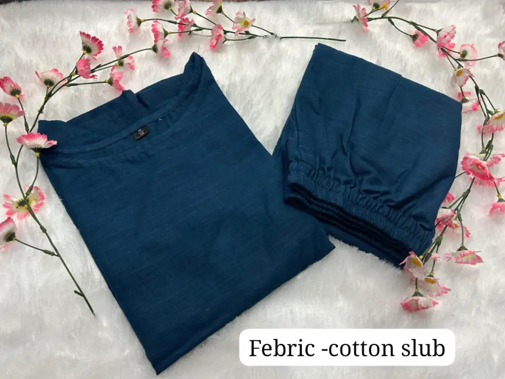 Premium cotton slub top with beautiful colours .Paired up with premium cotton slub plazo with 2 side pocket